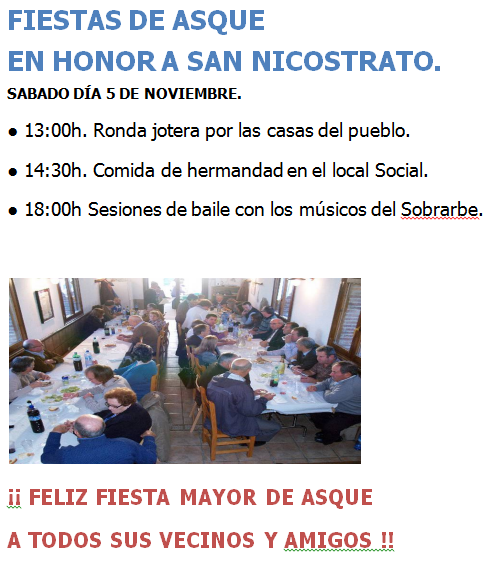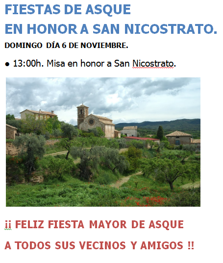 Los días 5 y 6 de noviembre, la localidad de Asque celebra sus Fiestas Mayores en Honor a San Nicostrato.
