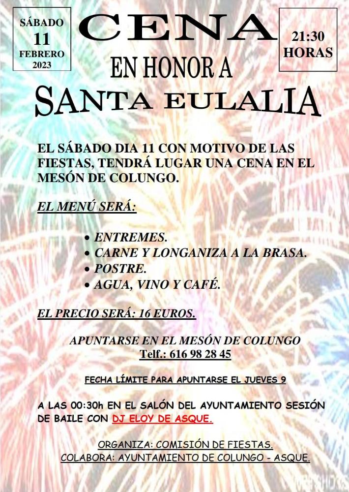 El próximo día 11 de febrero, sábado, tendrá lugar la celebración de una cena con en Honor a Santa Eulalia, una fiesta que debido a la anterior crisis sanitaria, llevaba dos años sin poder celebrarse.