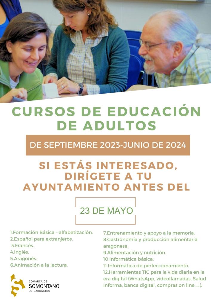 La Comarca de Somontano de Barbastro ha enviado a los Ayuntamientos la información correspondiente para los próximos Cursos de Educación de Adultos que se impartirán de septiembre de 2023 hasta junio de 2024.